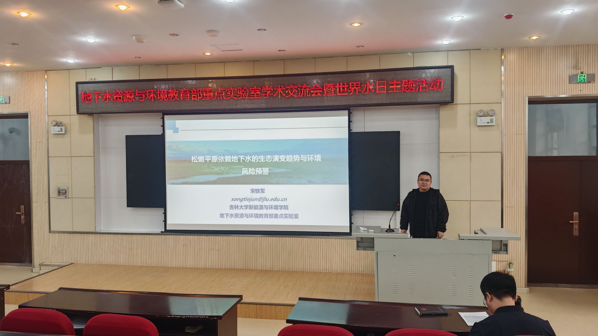 副院长秦传玉教授进行了会议致辞,回顾了世界水日的由来和主旨,重点介绍了2026年“世界水日”和“中国水周”的活动主题。重点实验室5位骨干教师—吉林大学张玉玲教授、吴佩鹏副教授、李峰平副教授、尹高虹副教授、宋铁军副教授,以及重点实验室开放课题负责人—沈阳环境科学研究院张芷豪副研究员,分别针对水资源形成和演化、地下水质调控、地下水相关生态环境问题等方面相继做了学术报告,报告主题分别为:有机污染地下水原位生物刺激修复技术与实践、潮汐影响下层状地层地下水人工补给对海水入侵的防治效果、松花江流域春季洪水形成机制及其气候响应、联合GRACE与GNSS的东北地区陆地水储量变化研究、松嫩平原依赖地下水的生态演变规律与环境风险预警、密度驱动下高盐渗漏废水在含水层中的迁移与监测的6个主题报告。报告人与参加会议师生进行了热烈地互动交流。会议最后,由吕航教授对本次学术交流活动进行了总结。